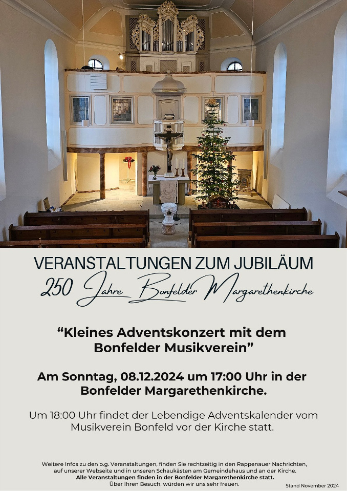 ADVENTSKONZERT am 08.12.2024 um 17 Uhr zum 250-jährigen Jubiläum der Bonfelder