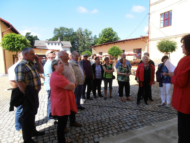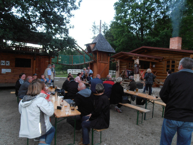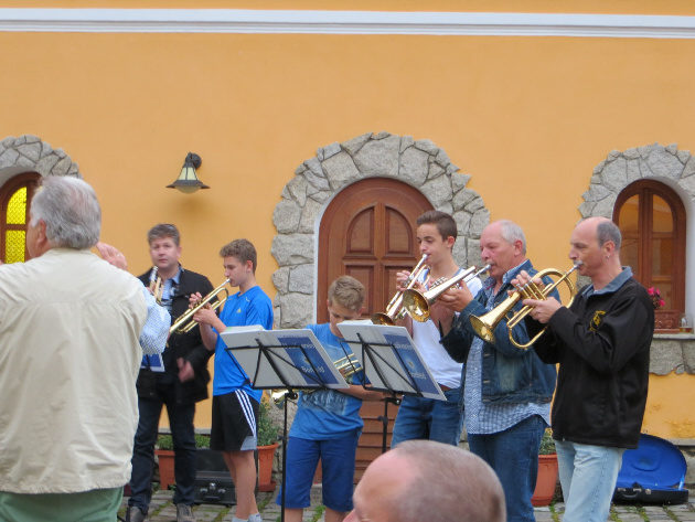 JAHRESAUSFLUG: Endlich war es soweit: Am Freitag, den 11.07.14 brachen wir am Nachmittag Richtung Tschechien auf. Unsere Reise wurde bereits nach 30 km jäh unterbrochen, als ein LKW-Unfall bei Öhringen unsere Fahrt für 1 Stunde im Stau unterbrochen hat. Bereits ca. 50 km vor unserem Ziel (Novy Kostel) in der Nähe von Cheb (Eger) deutete sich ein Unwetter an. Bei Ankunft in unserem „Hotel Am Speicher“ hatte das Unwetter auch dort gewütet, was einen Stromausfall im ganzen Hotel und im Restaurant verursacht hatte. Doch anstatt Trübsal zu blasen, wurden kurzerhand die Instrumente ausgepackt und ein kleines Platzkonzert abgehalten. Nach kurzer Zeit kam dann auch der Strom zurück und wir konnten unser Abendessen genießen.