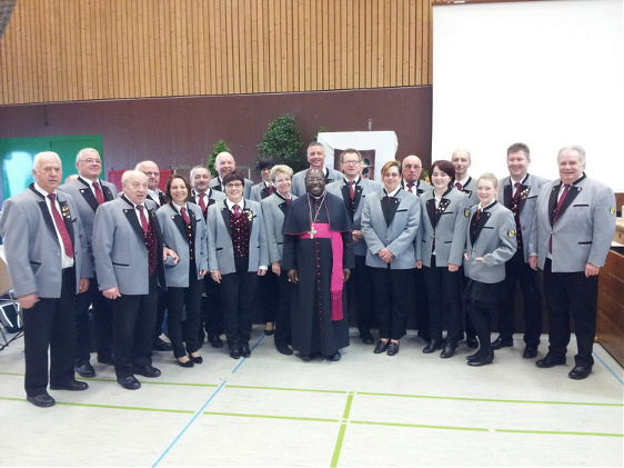 Das Bild zeigt den ugandischen Bischoff zusammen mit den Musikern nach dem Konzert.