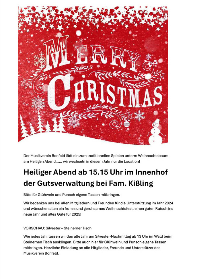 Wir wünschen allen ein frohes und gesegnetes Weihnachtsfest! Bitte besuchen Sie uns am Heiligen Abend ab 15.15 Uhr im Schlosshof Bonfeld. Wir möchten Sie musikalisch auf das Weihnachtsfest einstimmen.