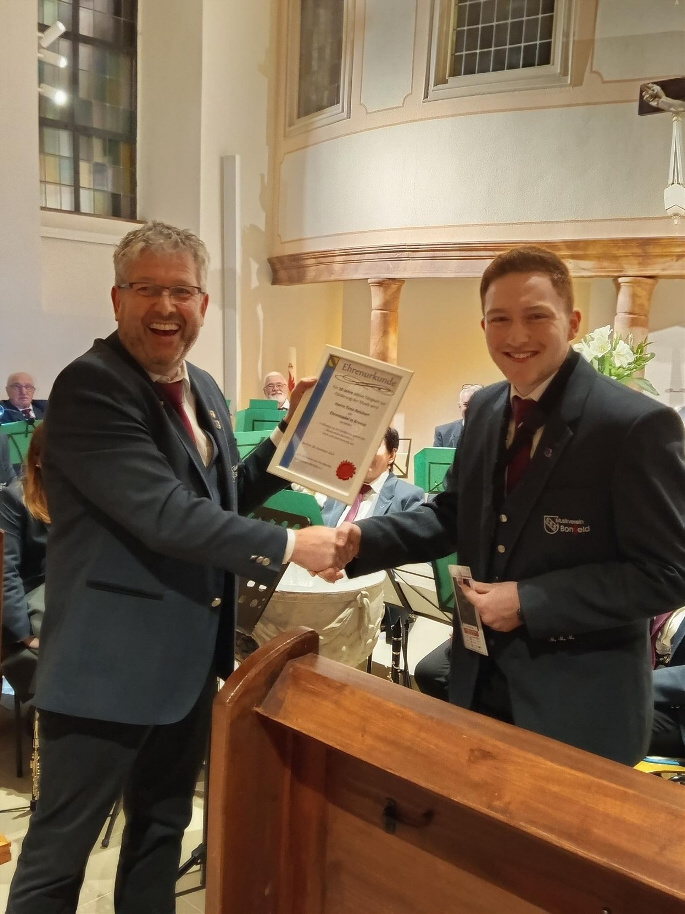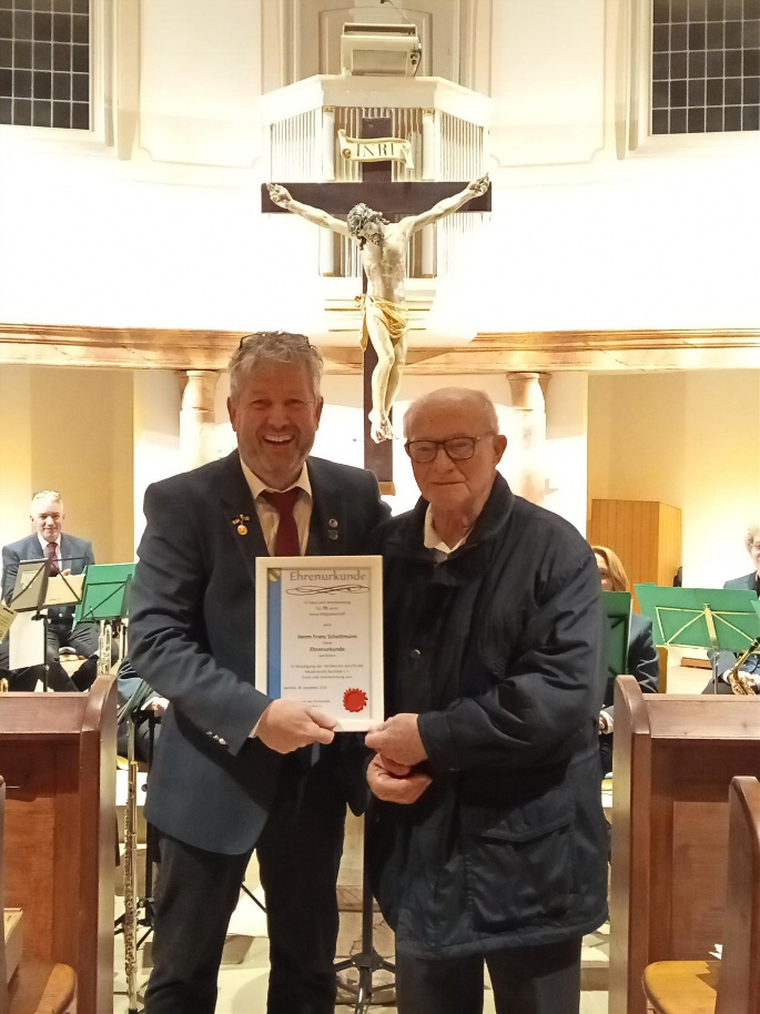 Für 10jähriges aktives Musizieren wurde Timo Reichert /Es-Alt - Saxophon mit einem Gutschein und einer Urkunde geehrt, Franz Schattmann erhielt für seine 70jährige passive Mitgliedschaft ebenfalls eine Urkunde und ein Präsent.